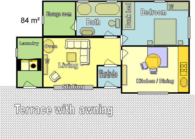 The living room has a large corner sofa with sleeping function and coffee table, a living room cabinet and an antique display cabinet, with all kinds of entertainment games. It has a direct sliding door access to the terrace. The wood-fireplace makes for cozy hours if it is storming outside. Further facilities include a satellite TV 47" with internet, DVD / Blu-ray, WLAN/WiFi with laptop, laser multifunction printer and a built-safe.